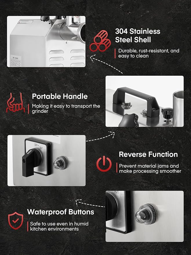 - 【Safe and Durable】The all-stainless steel body is rust-proof and durable, safer and longer-lasting than plastic/cast iron. It comes with a mobile handle and a reverse anti-stuck machine design to easily handle frozen meat and fascia.